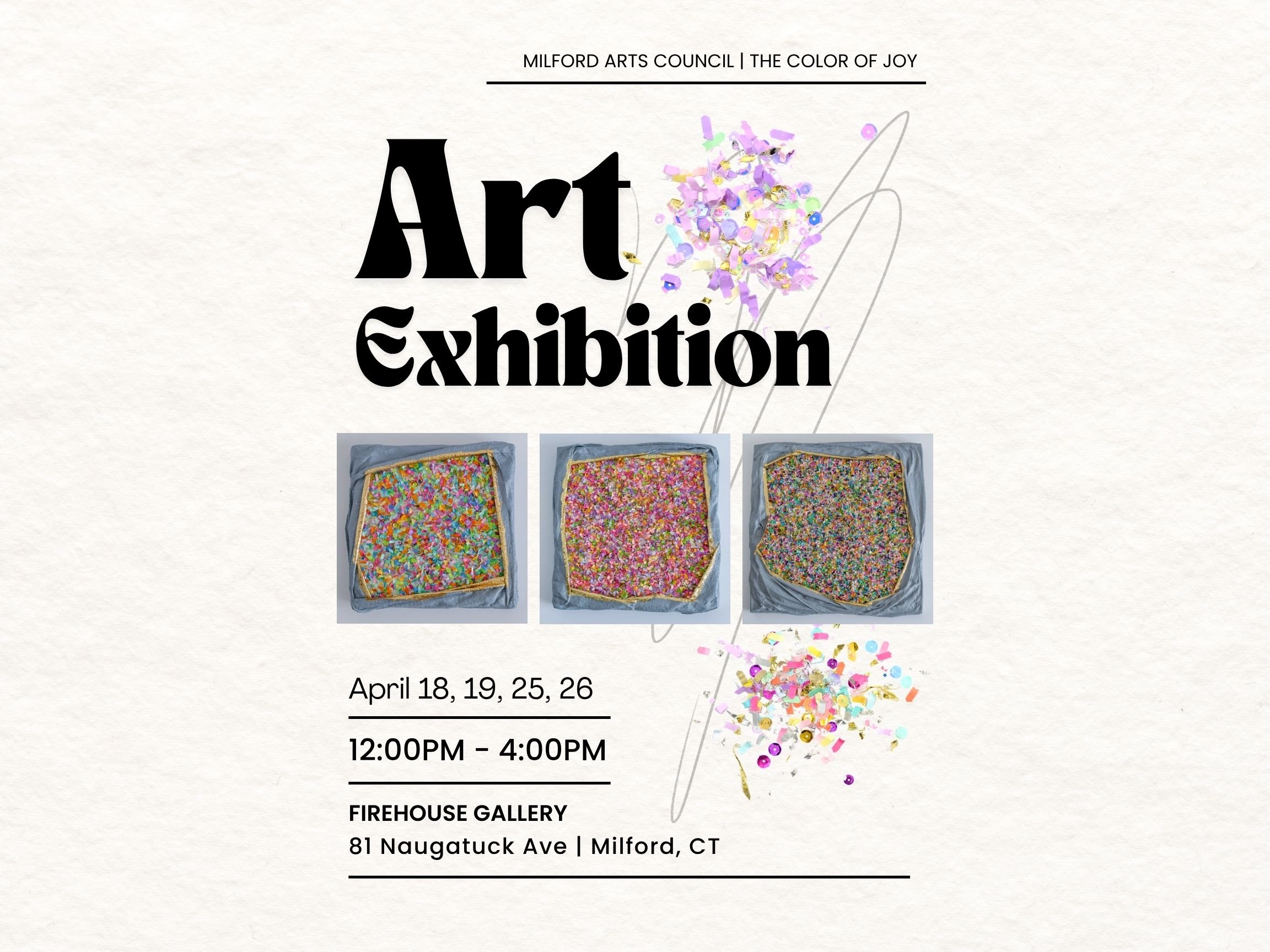 Back to All Events “The Color of Joy” Art Show Sunday, April 19, 2026 12:00 PM 4:00 PM Firehouse Gallery 81 Naugatuck Avenue Milford, CT, 06460 United States (map) Google Calendar ICS Free to attend; art will be available for sale.Along with a variety of art by fellow local artists, I will have three unique confetti geodes available in the show, hosted by the Milford Arts Council. Hope you can check it out!